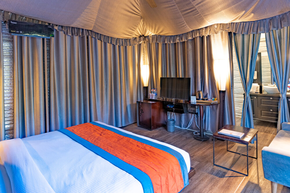 Discover unmatched space and comfort in our exclusive Family Suite Tent—crafted for families or close-knit groups seeking privacy and luxury in the heart of nature. This unique accommodation features two expansive bedrooms, a spacious entertainment room and a private outdoor deck offering panoramic views of the lush resort grounds. With private entry, en suite baths, walk-in wardrobes and round-the-clock service.